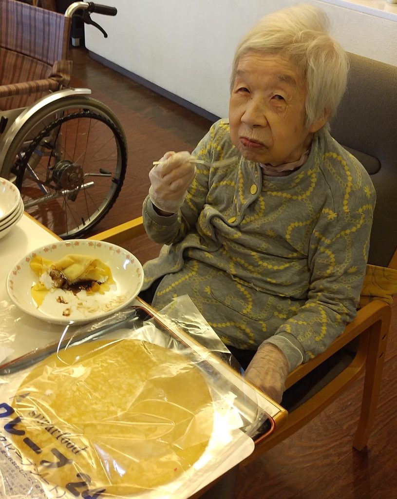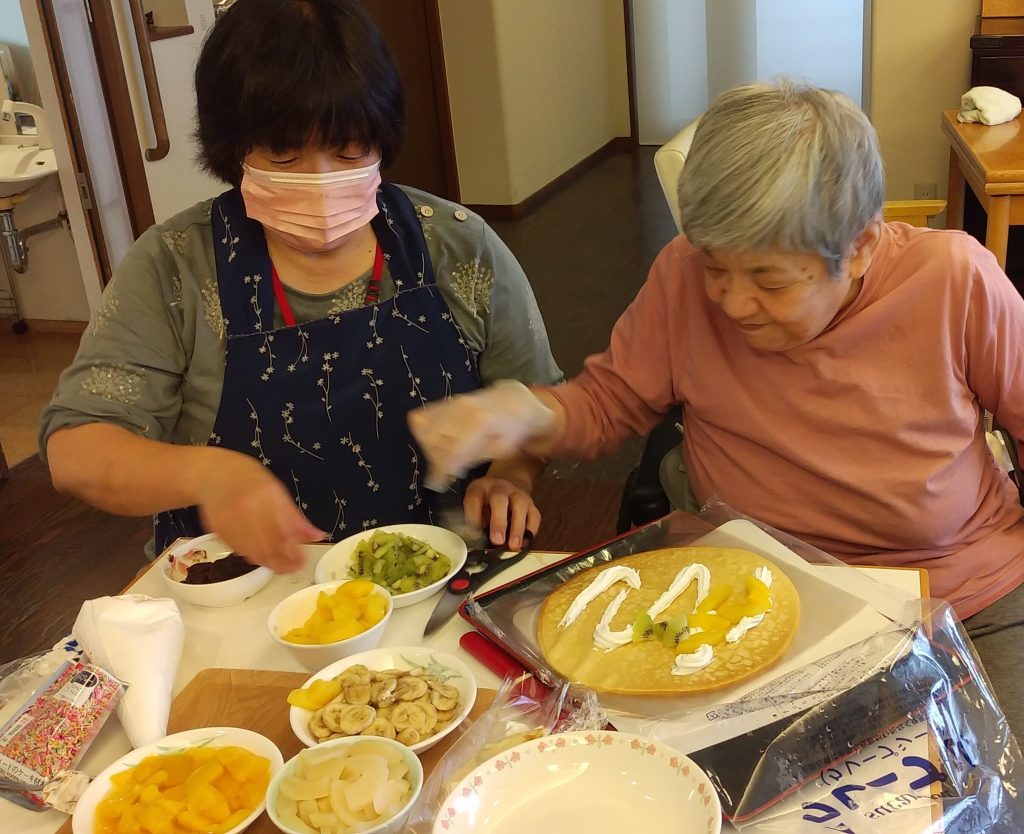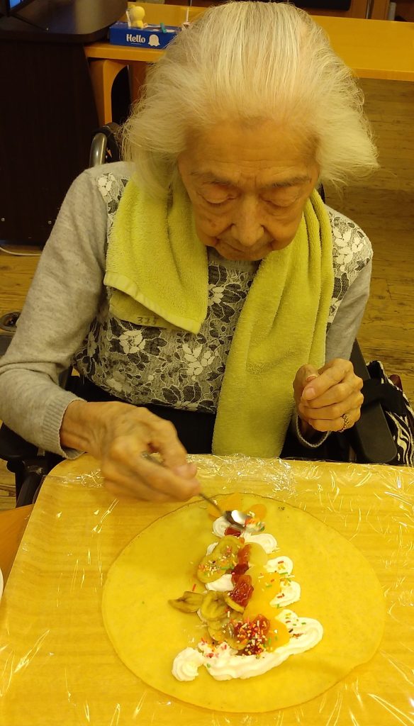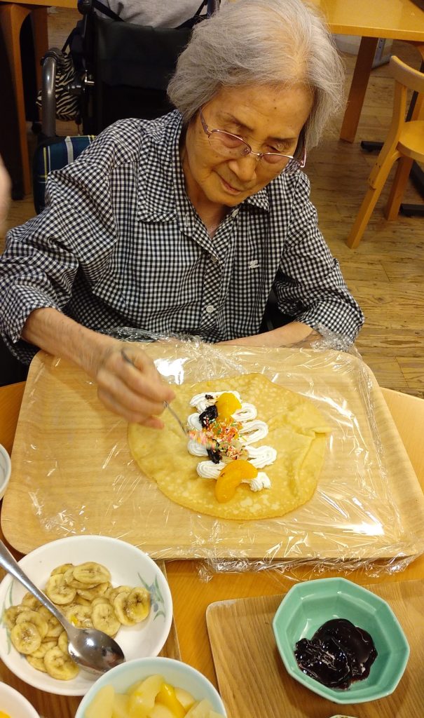 職員と一緒に好きな具材をトッピングし、入居者様それぞれ、オリジナルのクレープを